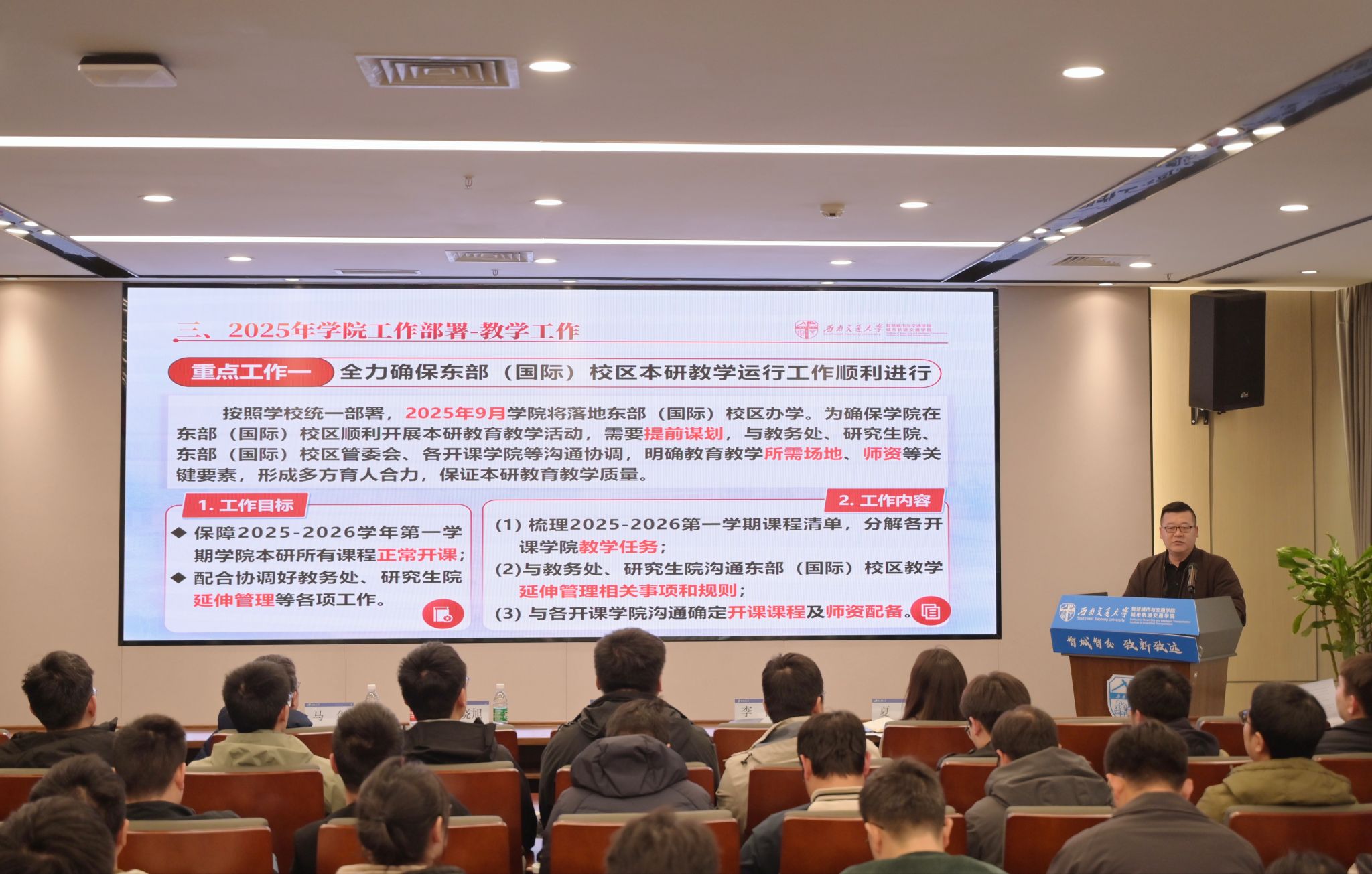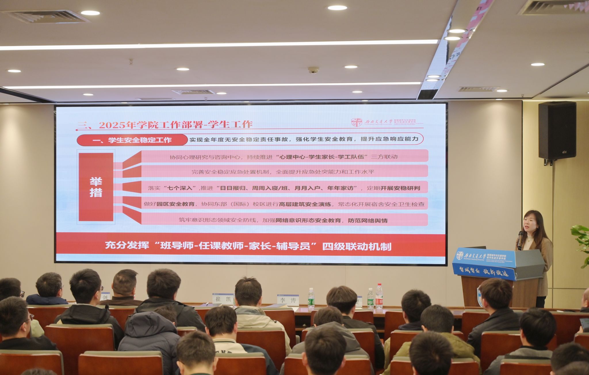夏夏从学生安全稳定工作、校区搬迁工作、高质量就业工作、学生工作一流建设四部分汇报部署了2025年学院学生工作。