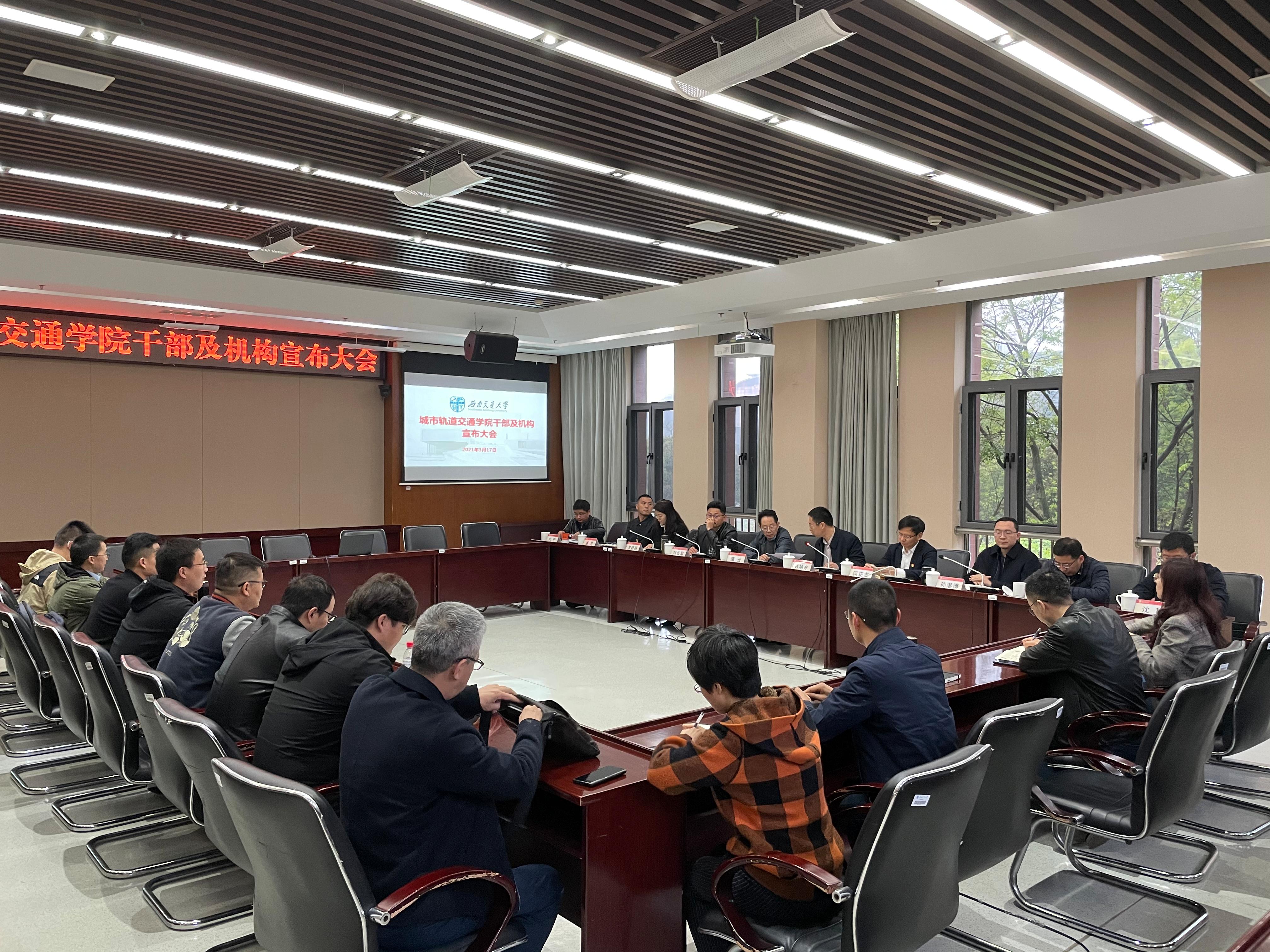 干部及机构宣布大会在犀浦校区举行,副校长兼学院党委书记蒲云出席会议,党委组织部部长韩旭东、人事处处长刘长军、党委组织部副部长沈哲及学院全体干部职工、专业负责人代表参加大会。会议由沈哲主持。