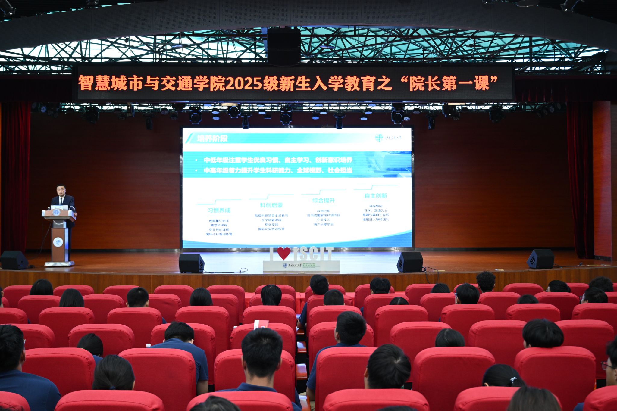 2025级新生开学典礼在犀浦校区二食堂三楼大学生活动中心举行。校党委常委、副校长何正友,校长助理、学院院长崔凯,学院党委书记李涛,中铁二院人力资源部部长杨善奎,学院副院长姬晓旭,副院长马剑,管理服务团队,2025级新生班级学术导师,朋辈导师及全体新生参加。典礼由学院党委副书记夏夏主持。