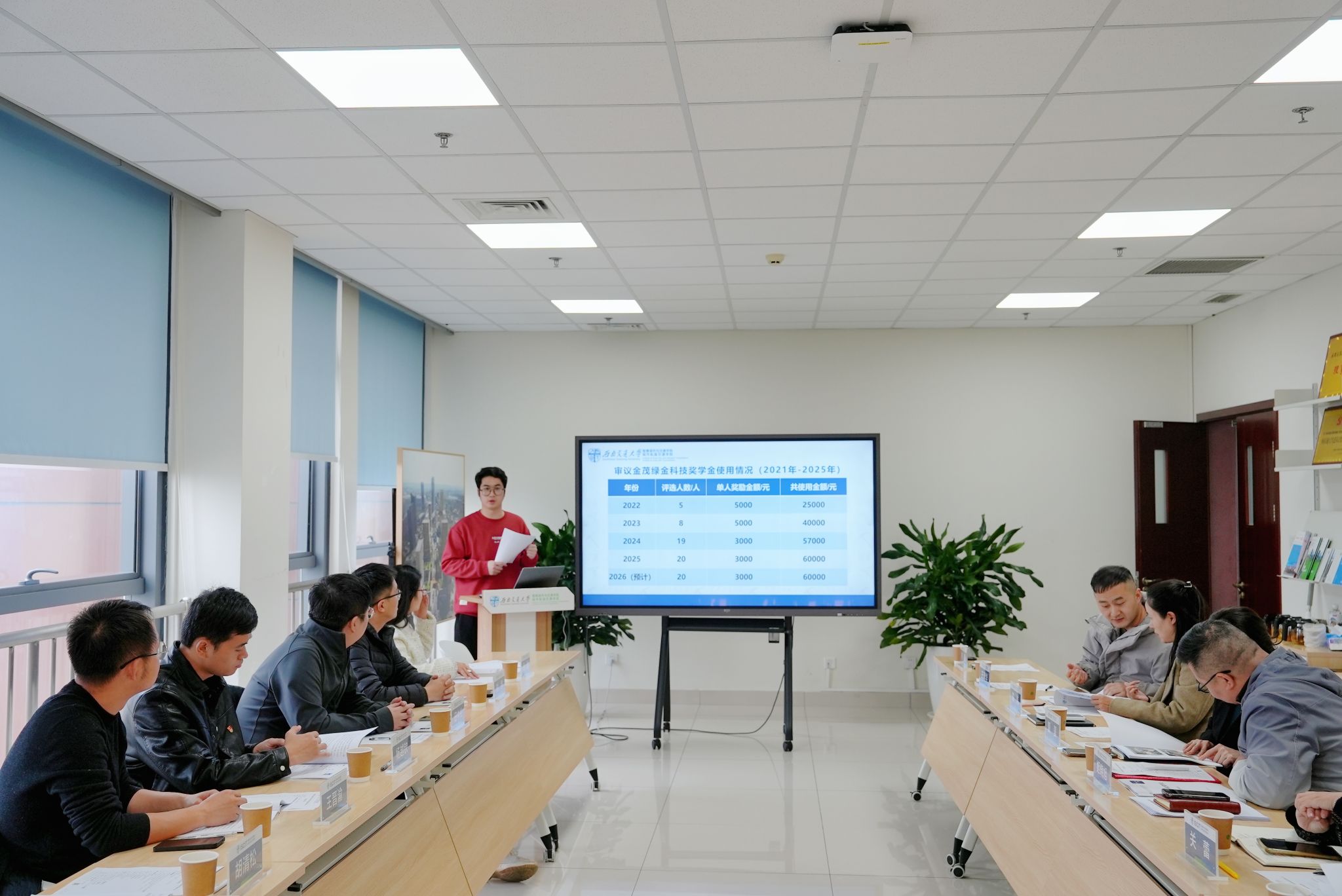 在奖学金审议环节,学院奖学金评选工作负责老师刘金阳就2025年金茂绿金科技奖学金评定情况、2021-2025年金茂绿金科技奖学金使用情况进行汇报,与会人员一致同意评选结果。
