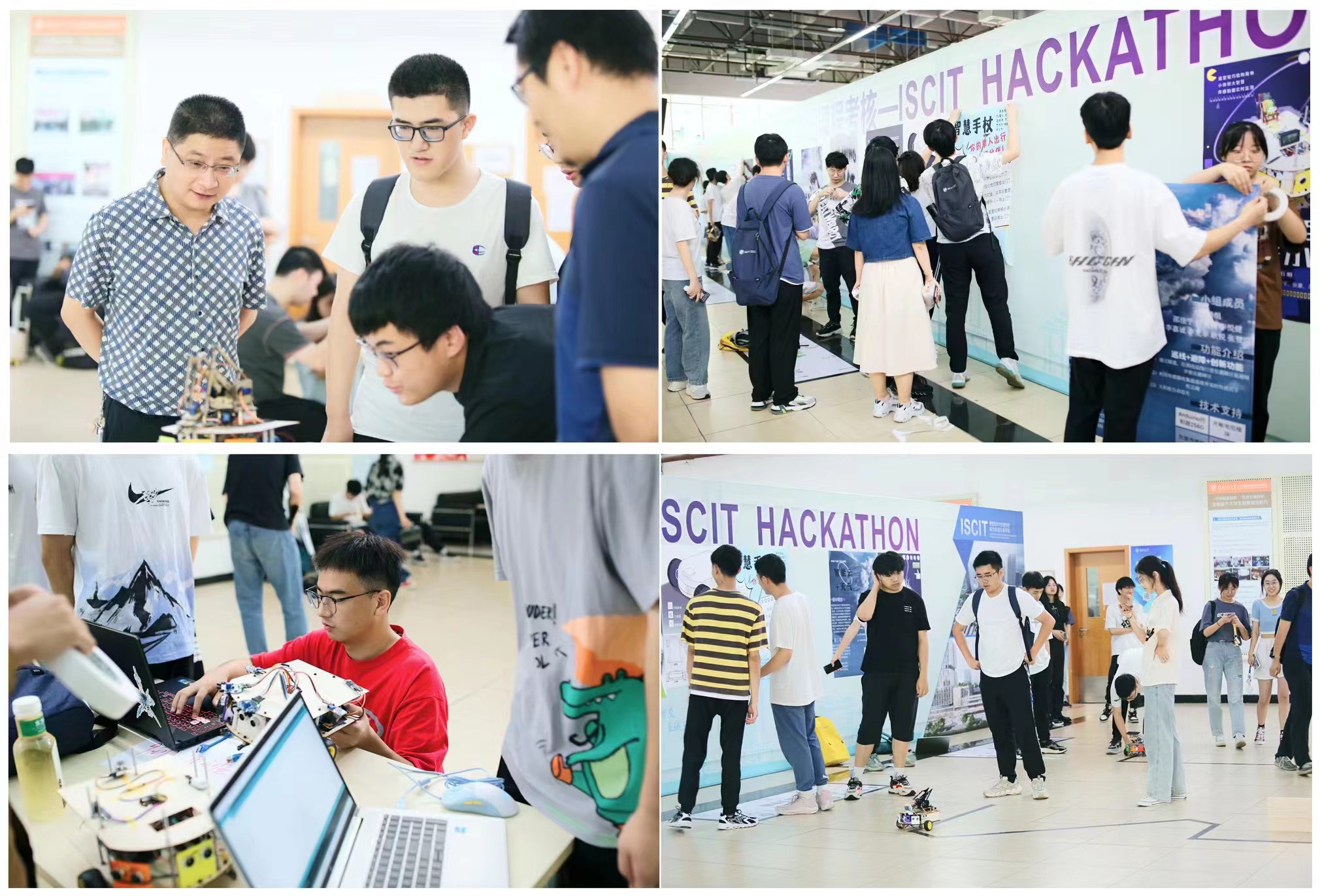 上午九点三十分,同学们带着自己的作品早早入场,进行海报张贴、赛道熟悉、机器人小车调试等准备工作,设计精美的小车和各类海报充分展示了同学们的想象力和创造力。