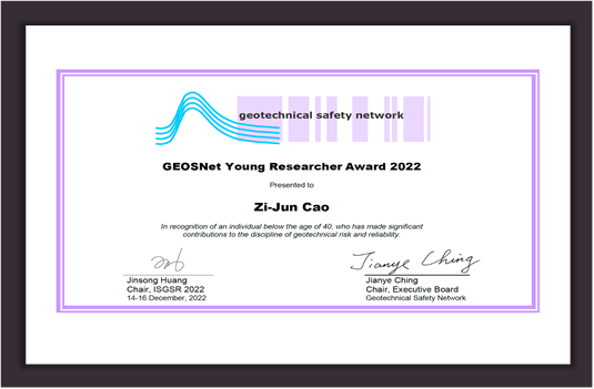 2022年12月14-16日,第8届国际岩土工程安全与风险会议(ISGSR2022)在澳大利亚纽卡斯尔召开,学院曹子君教授获得国际岩土工程安全学会颁发的青年科学家奖(GEOSNet Young Researcher Award)。该奖项表彰词为: