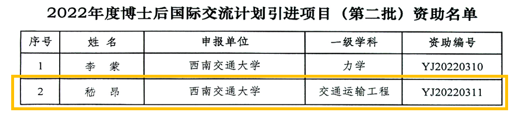11月21日,全国博士后管理委员会发布了2022年博士后国际交流计划引进项目结果通告,我院青年教师嵇昂获得了第二批立项。