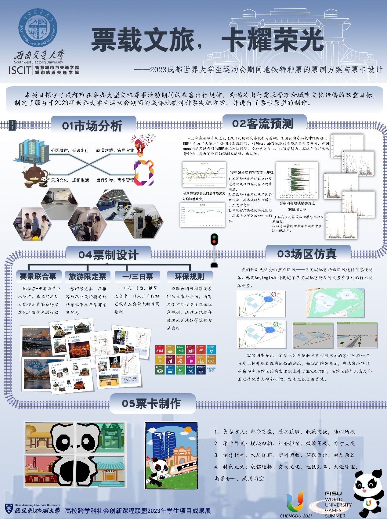 参赛项目以成都大运会为设计背景,在我校王琳老师、黄兴民老师和成都轨道集团李静博士的联合指导下,智慧学院颜晓惠、谭惠丹同学和交运学院杨渊、兰鑫锐、罗恒彧同学组成跨学科团队,利用智慧学院和交运学院相关实验室的软、硬件设备,进行了市场调研、客流预测和场区仿真,自主完成了地铁特种票的票制方案设计和票卡制作。