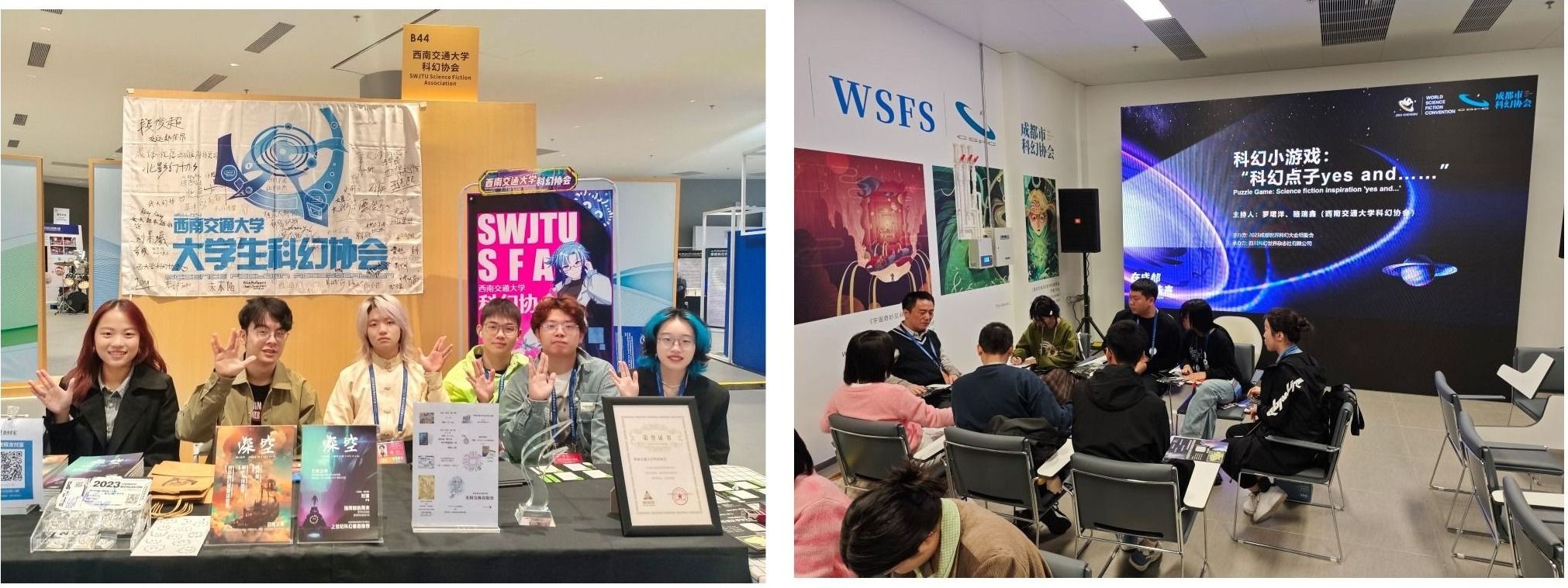 科幻协会作为团体嘉宾深度参与其中。协会指导老师敬春元受邀参加国际青年科幻联盟成立及倡议大会,协会成员受邀参加高校科幻协会活动经验分享会,共同推进中国科幻事业和科幻产业的发展和创新;协会全程在大会场馆一楼幻迷展厅设置展位,宣传展示协会发展成果,向国内外嘉宾、会员等参观者分发和交换协会自制“会刊”、协会徽章等文创周边物料,并联合清华大学科幻协会、四川大学科幻协会、电子科技大学科幻协会三所友校幻协共同组织集章活动;同时协会还在成都科幻馆水星厅承办主题沙龙,组织来宾一起参与口头科幻故事创作,共同放飞想象。