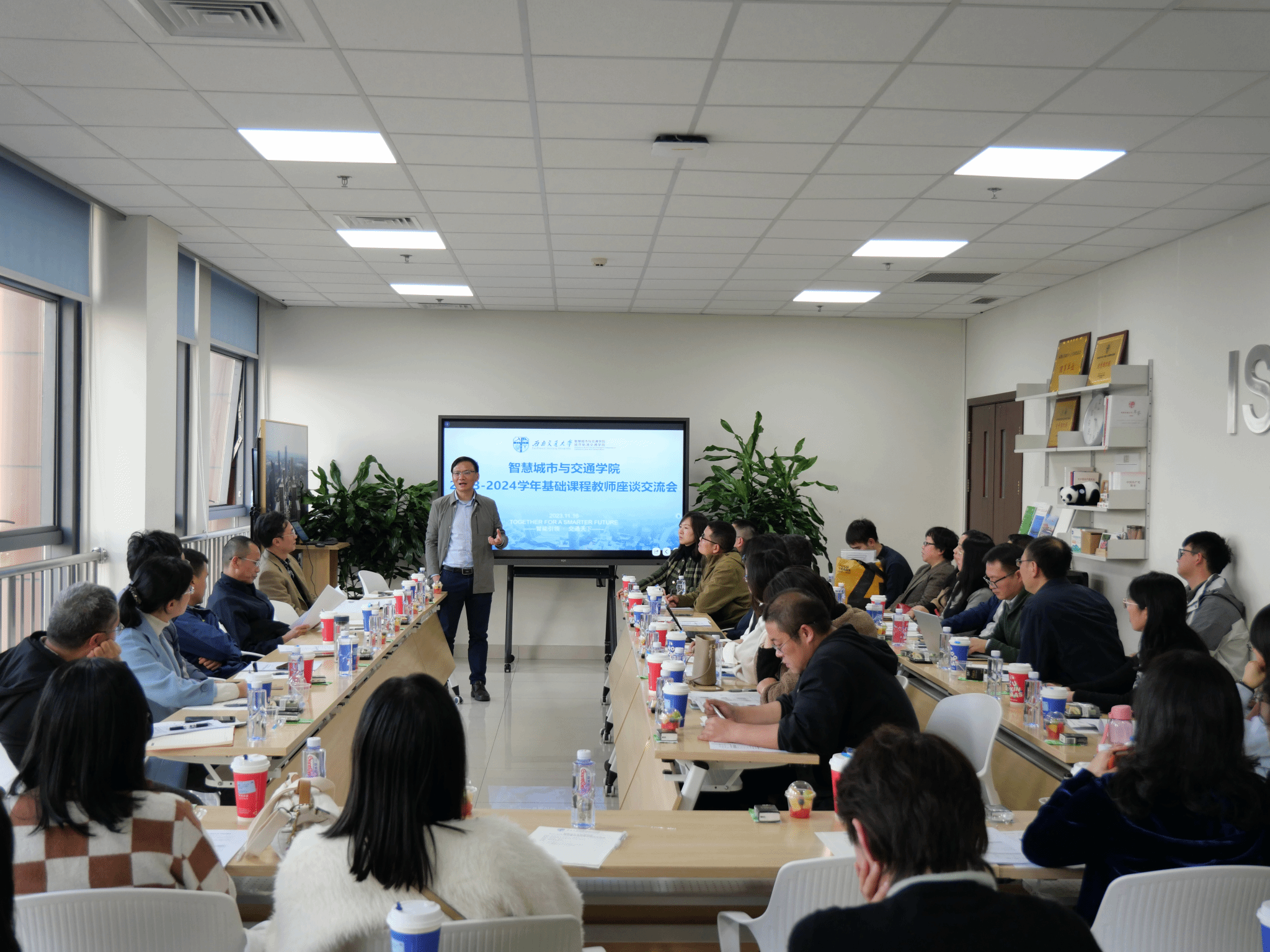 基础课程教师座谈交流会是学院推进“教-学-管”三位一体协同育人模式的重要途径,旨在强化教学互动、促进学教深度融合,不断提升人才培养质量。11月16日,本学期第二次院长下午茶暨2023-2024学年基础课程教师座谈交流会在X31641举行。物理科学与技术学院副院长李相强,外国语学院副院长易红,数学、英语、物理课程组负责人和任课教师代表,学院院长何正友、副院长孙湛博、学生管理办公室主任夏夏以及全体辅导员参加座谈。座谈会由院长何正友主持。本次交流主要围绕如何进一步巩固教育教学质量,提升学生学习能力及实践应用能力展开。