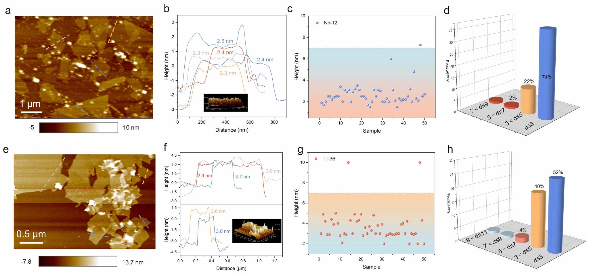通过AFM测试证明1-3层MXenes 具有高产率。厚度(d)约为 3 nm的 MXene 可视为单层。因此,3~5 nm 代表双层,5~7 nm 对应3层。生物热处理后Nb2CTx(Nb-12)的厚度为 2.3-2.5 nm(图 2a,b),对应单层 MXenes。为了准确反映单层到3层 MXenes 的产量,我们统计了 50 个纳米片的高度(图 2c)。如图 2d所示,单层 MXenes 的数量为 37 个,双层为 11 个,三层为 1 个,1-3层比例高达98%。同样,Ti-36 中单层到三层的比例高达 96%,其中单层占 52%,双层占 40%,三层占 4%(图 2e-h)。