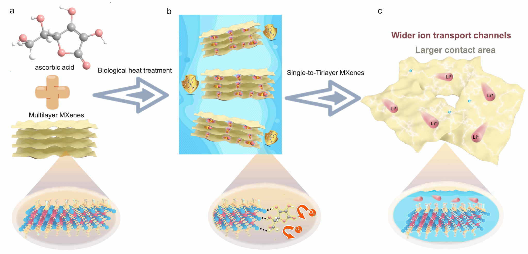 提出了一种生物热化学方法,制备出高产率和高质量的1-3层 Nb2CTx 和 Ti3C2Tx。在加热(75 °C)条件下,H2O 的布朗运动和抗坏血酸边缘保护的协同作用使 MXenes 得以有效分层(图 1a,b)。生物热化学法处理后,1-3层 MXenes 具有快速的传质动力学,离子传输通道更宽,电极/电解质接触面积更大(图 1c)。先前的实验和模拟证明,高温会加速二维材料的层间振动, 降低取向力,从而削弱层间范德华力。同时,由 H2O 的布朗运动驱动的剪切力可以实现二维材料的分层。因此,添加抗坏血酸可封装 MXenes 的边缘(图 1b),从而抑制高温氧化。