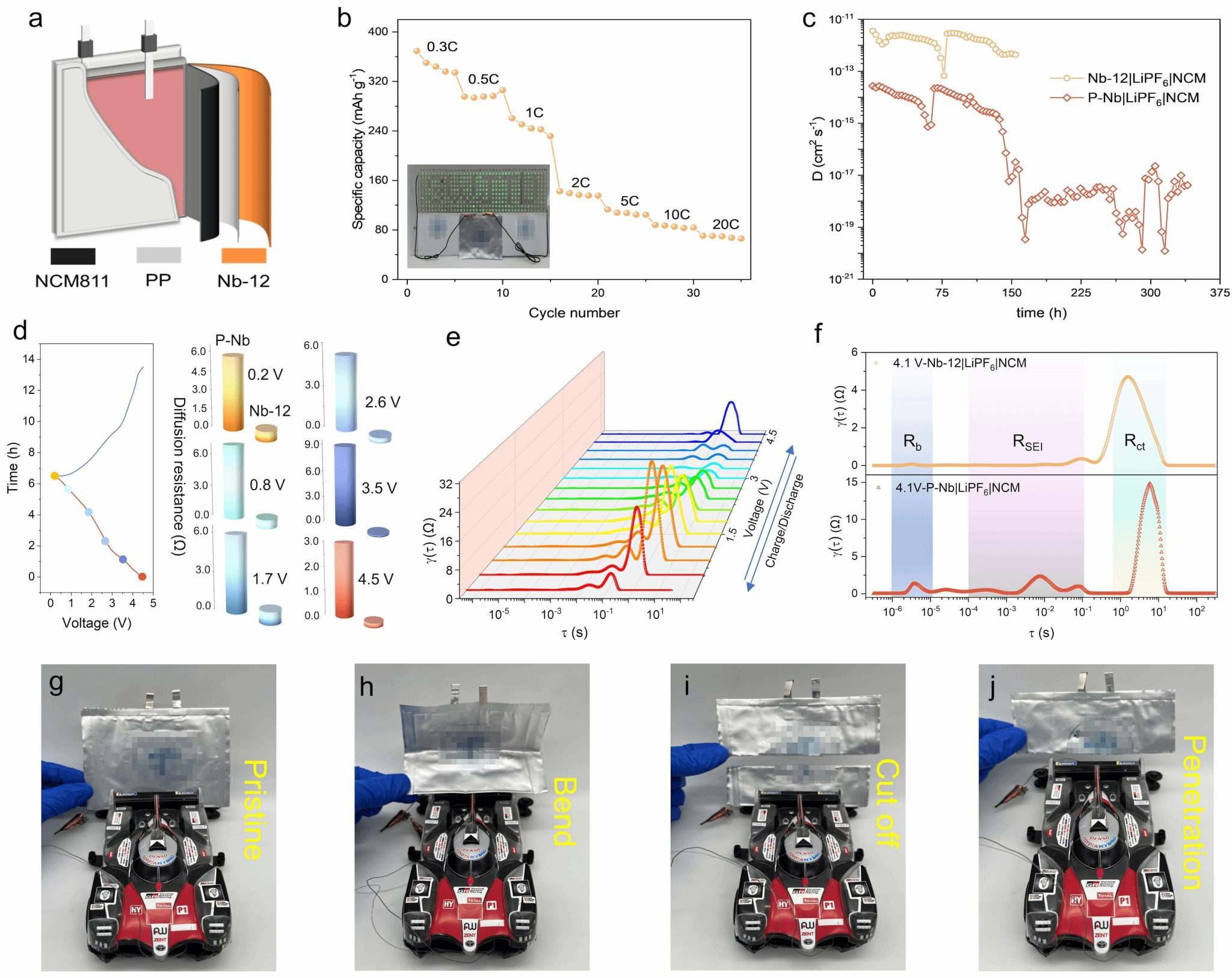 为了证明快速传质动力学有助于促进实际应用,组装了300 mAh 的软包 Nb-12|LiPF6|NCM LIC(0.3 C 时为 350 mAh g-1)(图 3a、b)。GITT 测试表明了 Nb-12|LiPF6|NCM 和 P-Nb| LiPF6|NCM LIC 在 Li+传输行为上的差异(图 3c)。在高电荷状态(90%)下,P-Nb| LiPF6|NCM LIC 显示出充电停滞现象,扩散系数显著下降。相比之下,Nb-12| LiPF6|NCM LIC在所有荷电状态下都能顺利充电并保持较高的扩散系数(约 10-12)。原位 EIS显示 Nb-12| LiPF6|NCM 在整个充放电过程中的电阻均比 P-Nb| LiPF6|NCM LIC 低得多(图 3d)。此外,弛豫时间分布结果(DRT)也论证了该结果(图3e)。在充放电过程中,Nb-12| LiPF6|NCM LIC 的 Rb 和 RSEI 峰强度几乎不可见。相比之下,P-Nb 的峰值强度较高,例如在 0.8 V、2.6 V 和 4.1 V 时(图 3f)。因此,1-3层 MXene加快了 Li+ 离子在界面和体相的传质。这也意味着,P-Nb 在 GITT 试验中的异常现象是由于较差的 Li+传质动力学造成的。为了探究其实际应用,我们将软包LIC给玩具赛车和排灯供能。启动赛车需要高功率密度,而长时间维持动力则需要高能量密度。软包 LIC 不仅能启动赛车,还能在 400 米以外为赛车供电(图 3g)。同时,软包LIC 还能为"SWJTU "LED 面板的持续运行超 20 分钟。为了进一步阐明其安全性,我们对软封装 LIC 进行了弯折、切割、针刺测试。图 4h-j软包 LIC 在经历 180° 弯曲、半切割和穿透后,仍能安全地为玩具赛车供电。因此,Nb-12|LiPF6|NCM LIC 具有显著的高安全性。
