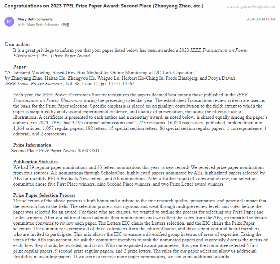 据悉,IEEE TPEL是国际电力电子领域最具影响力的学术期刊,是电气工程领域顶级SCI期刊之一。其Prize Paper Award旨在表彰该刊发表的具有突出原创性、高撰写质量并在相关领域具有重要潜在应用价值的论文。获奖论文需要经过评审委员会多轮评选和投票,被公认为是国际电力电子技术领域学术论文的最高荣誉。这是继赵朝阳副教授于2022年获得电力电子领域知名高水平国际期刊IEEE JESTPE优秀论文奖后,获得的又一重要论文奖项。