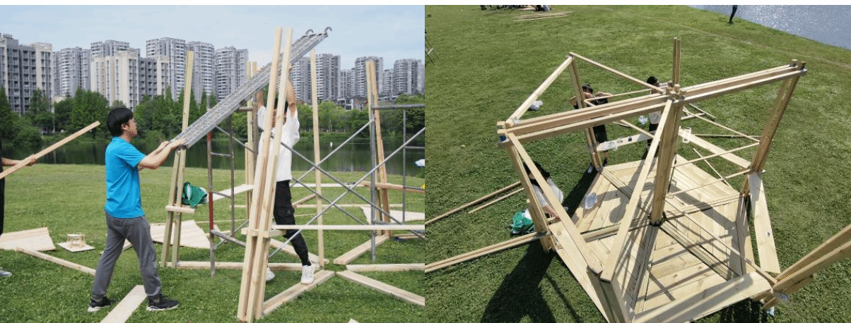整体的把控对于建筑的质量又或者是速度来说都是至关重要。将一个大的整体不断细分,最终成为一个又一个的模块搭建,在这个过程中,每一个角度,每一段线长都需要前期的不断钻研。建造过程中的协调合作、分工搭配时细致入微的思考、在遇见差错时的灵活处理,这是我们通过实践学习到的宝贵经验。