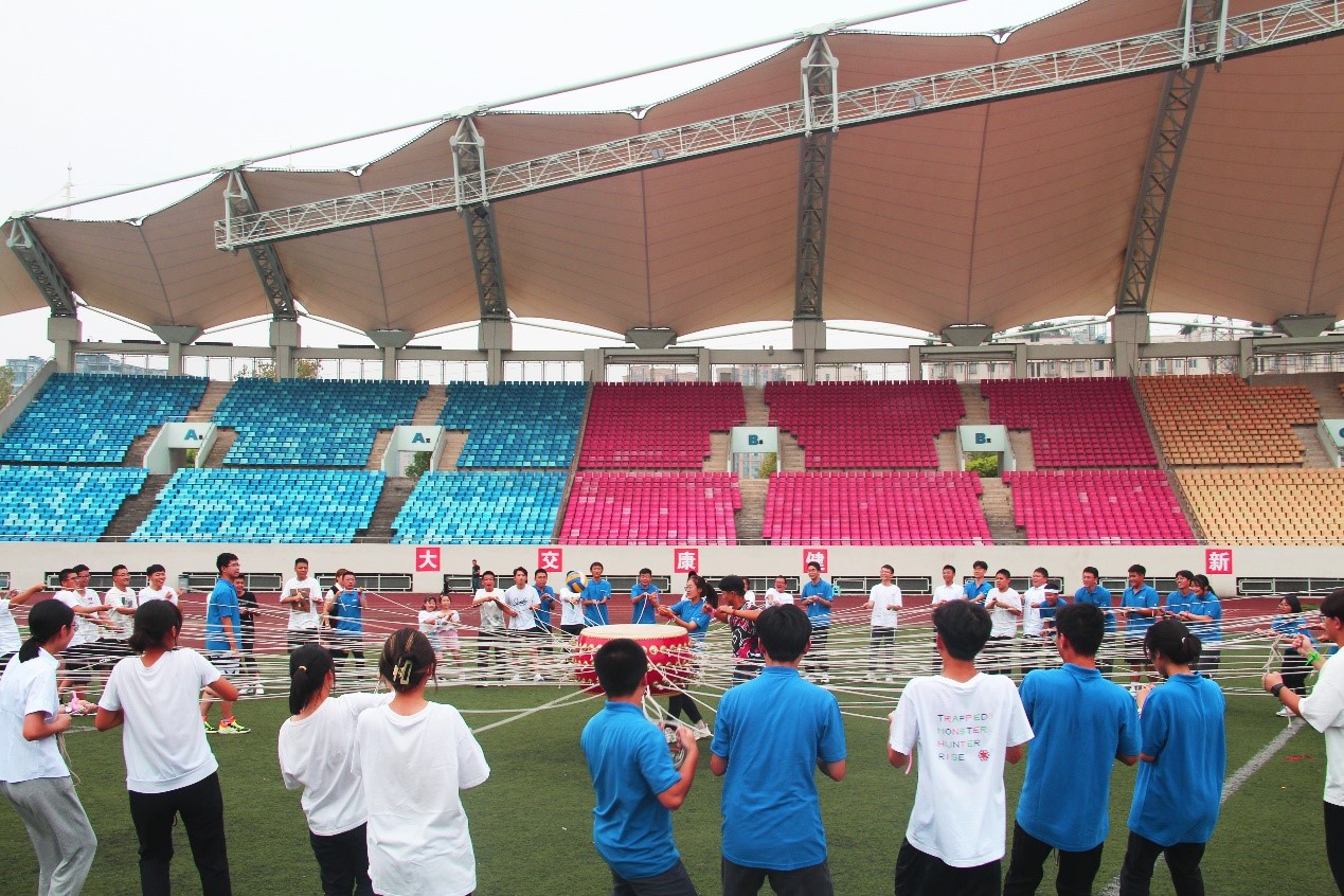在百人战鼓环节里,各班同学们组成队伍携手作战,抬起大鼓来颠球。大家心往一处想,劲往一处使,球与鼓面碰撞的隆隆鼓声,填充了整个运动场。四队均创造出佳绩,最高记录被定格为88个。这项环节也让大家充分地认识到了团结的重要性。