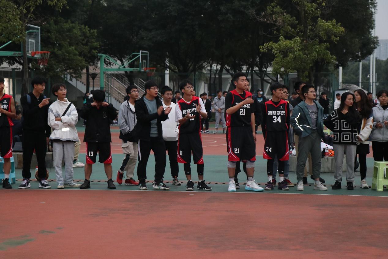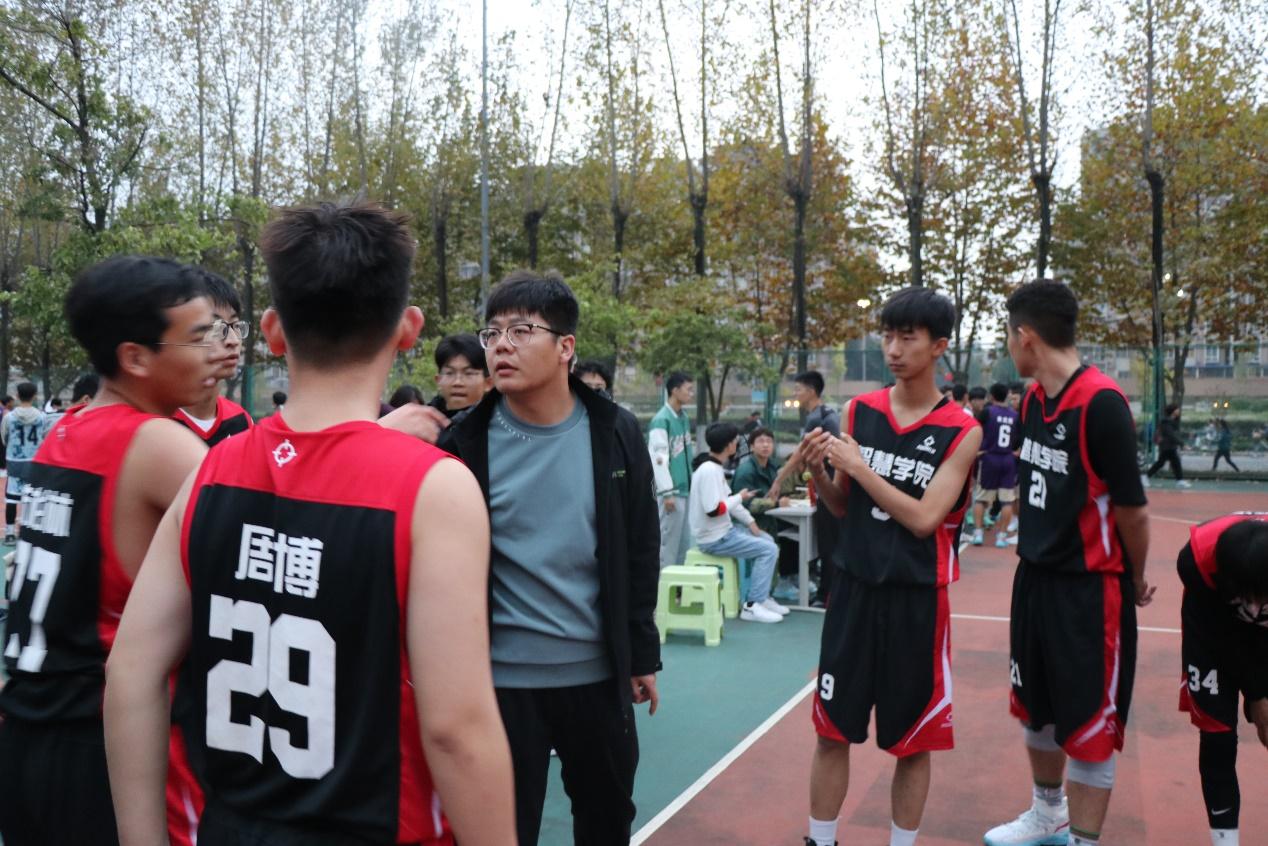 11月1日下午5点50分,学校新生篮球赛于北区篮球场正式开打,智慧学院首战物理学院,球队教练任福老师到场指导,2021级新生辅导员敬春元、宋治东老师和同学们到现场为队员们喝彩加油。
