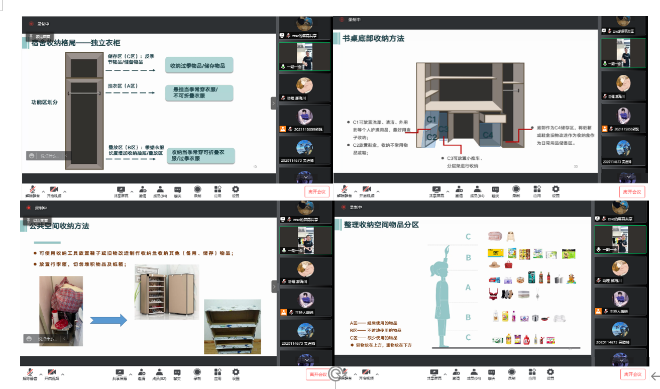 本次线上培训作为“小收纳·大智慧”宿舍文化节的一环,为同学们分享了收纳原理和收纳技巧,旨在帮助同学们养成良好的生活习惯,打造更舒适的学习和生活环境。第一届“小收纳·大智慧”宿舍文化节正在火热进行中,学院也将继续以劳动教育为主题,着力培养学生的劳育素养,将劳动教育做实、做细。