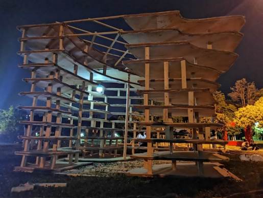 作品经历过多次的打磨,为解决内部无光源、板材塌陷、曲线不圆滑等问题,小组从多方面思考实践得出解决方案,如减少木板层数、在每一层板材中添加龙骨、化曲为直、增大层间隙等。