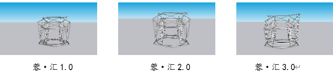 作品经过小组与指导老师的研讨推敲,为解决作为运动驿站供给休憩的问题,内部座椅从无到有,后经过多次研讨建模模拟并权衡后,将原本三面围合对比三面留白的座椅排布方式改为留白围合交叠的排布方式,旨在提升内部空间给人的主观感受的同时提升外部视觉效果。对于顶部花瓣框架的改动主要是由内二、三框架的对称分布改为了从外到内四朵花瓣顺时针顺向排布,提升了顶部视觉效果的拟真性,使其与设计理念“含苞待放的木芙蓉”多了几分贴切感。