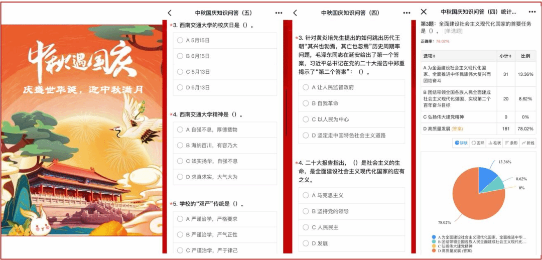 的校史等多个主题,促进了同学们了解中国共产党、共青团、西南交大的相关知识,激发同学们爱党爱国爱校的热情。本次活动为线上模式,为同学们的假期生活增添了一抹亮色。同学们的答题热情也十分高涨,据统计,超过300名同学参与了此次线上答题活动。