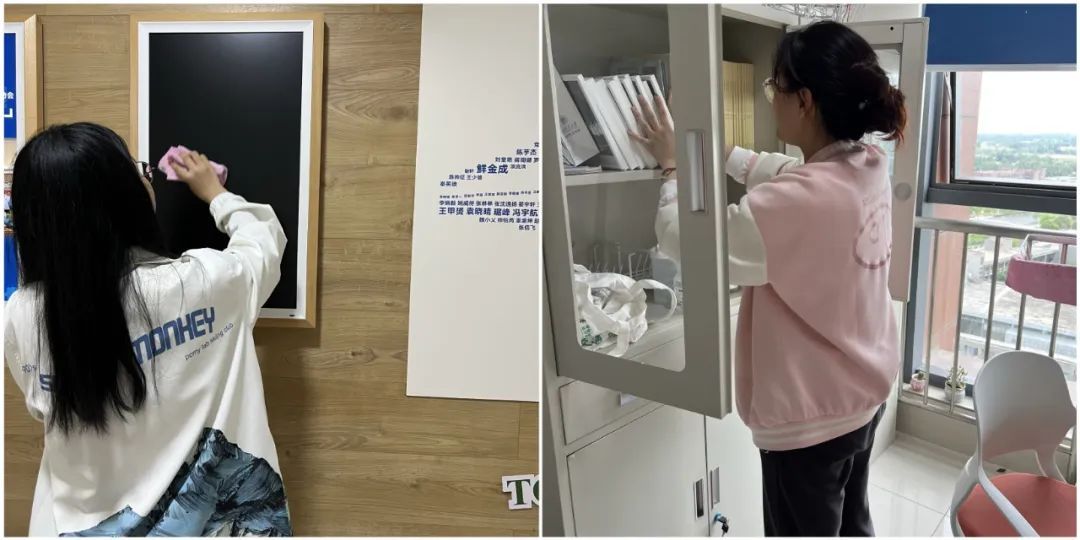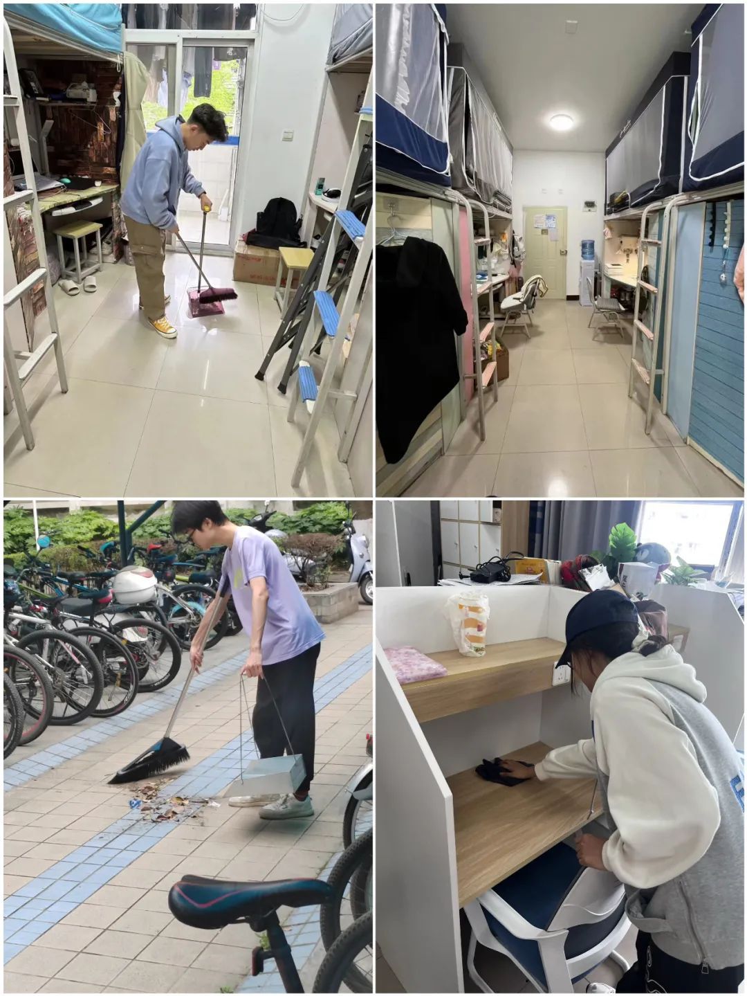 在学生园区,学院号召开展卫生大扫除,学生积极响应。班级生活委员组织、寝室长带头,各班学生积极参与宿舍卫生大扫除,共同维护整洁、有序、健康的学习生活环境。学院志愿者在劳动实践区、园区自习室组织清扫,维护园区公共责任区域的卫生和秩序。