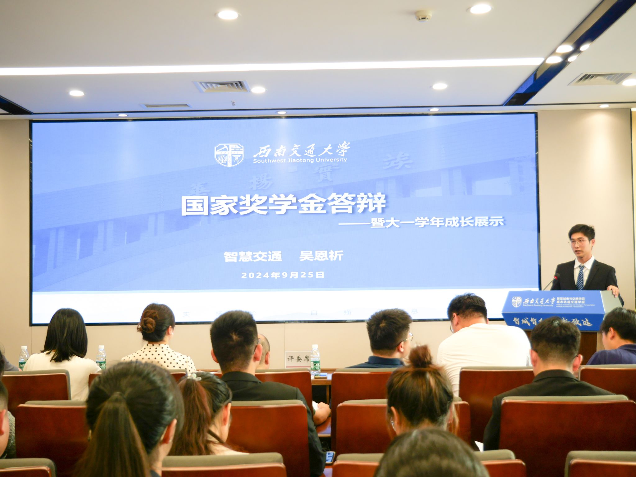 为切实做好国家奖学金评审工作,充分发挥优秀学子榜样引领作用,促进学院学风建设,学院于9月25日在X30820报告厅开展2023-2024学年国家奖学金答辩展示会。学院党委书记李涛、副书记夏夏、综合事务办公室主任王若羽、专业教师代表、辅导员老师代表作为评审嘉宾出席,110余名低年级同学现场观摩本次答辩展示会。