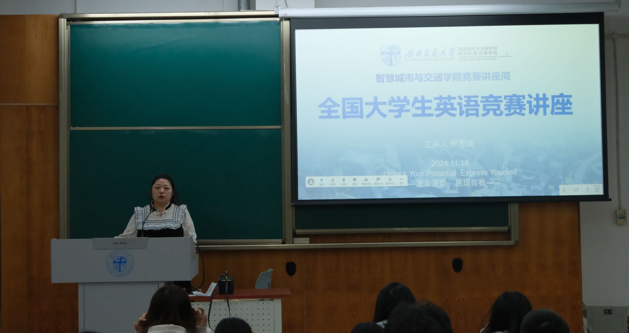 首场讲座由学校英语学习中心尹思婧老师主讲。尹老师向同学们介绍了学校英语竞赛的培养机制和活动类别。她指出,学校配备了专业的教师团队,开设了线上管理和竞赛类选修课程,为有意愿参赛的同学们提供了丰富的学习资源和培训内容,并鼓励同学们勇于尝试、突破自我,充分挖掘自身潜藏的英语才能。