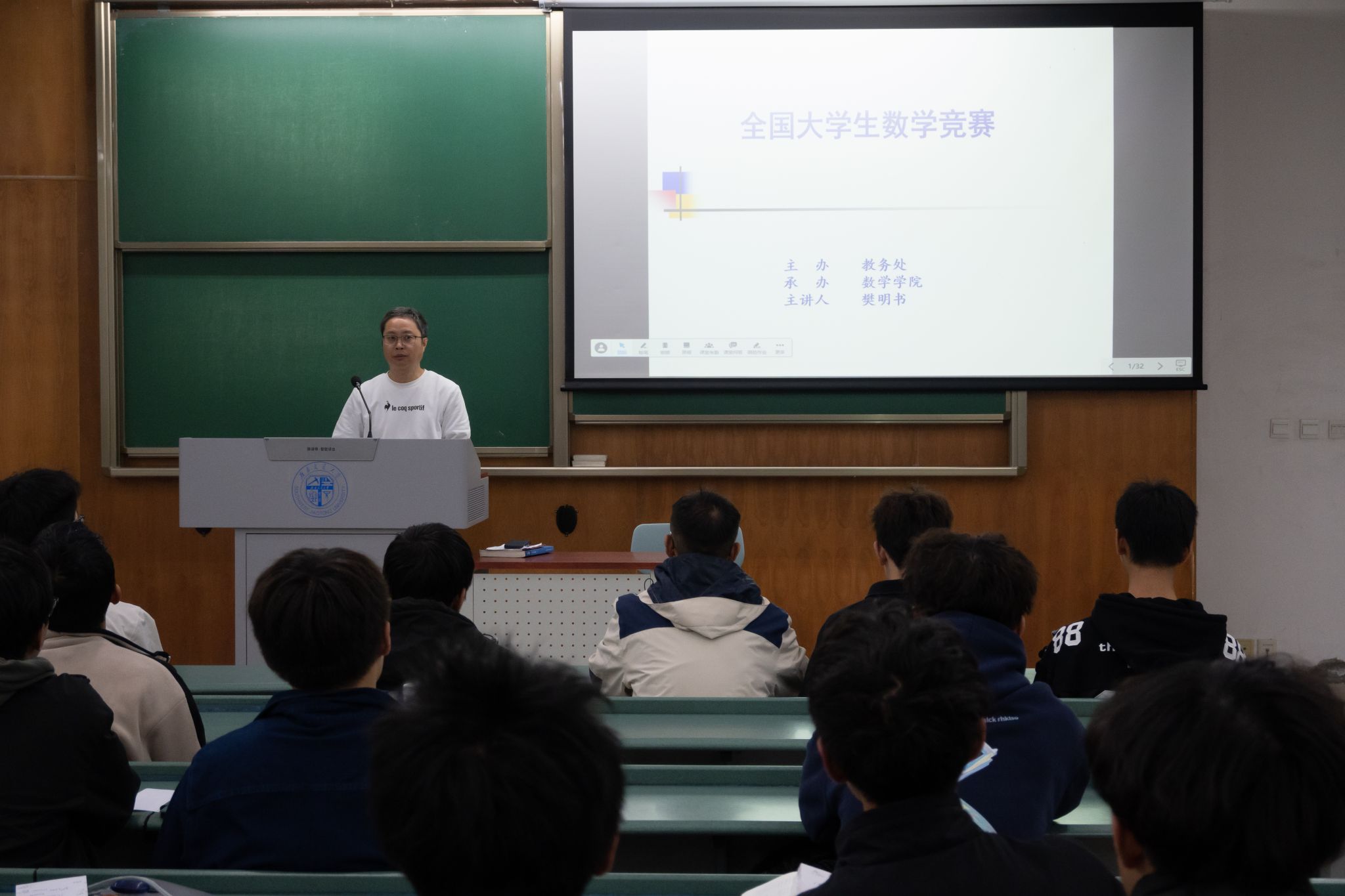 全国大学生数学竞赛讲座由樊明书老师主讲。樊老师详细解读了全国大学生数学竞赛的备赛策略、比赛流程和奖项分布,并推荐了优秀学习资源,鼓励学生课外积极提升。他指出,学校配备了专业的教师团队,能够为有参赛意愿的学生提供有力支持。随后,马鲁越学长分享了他宝贵的参赛经验,并向同学们推荐了与竞赛相关的书籍。