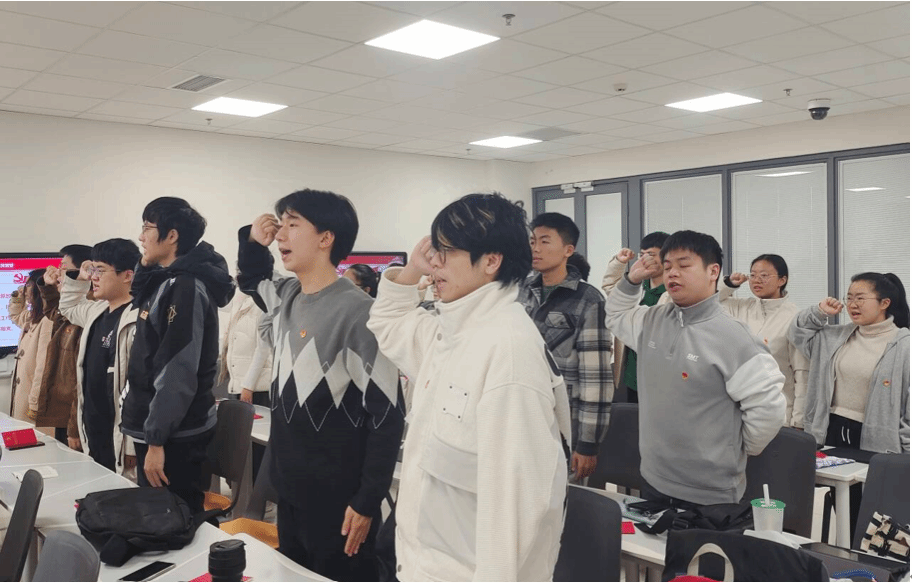 入党宣誓在庄严肃穆的《国际歌》中拉开序幕,全体党员在王子琦同志的带领下,面向党旗,高举右手,庄严宣誓。宣誓结束后,支部党员为魏岚、敬春元和冯琪祺三位同志举行了“政治生日”庆祝活动。