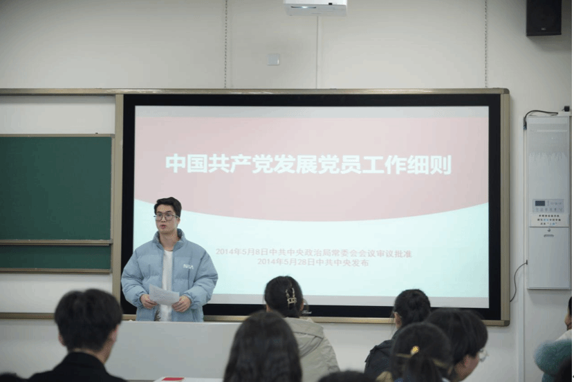 刘金阳、秦浩喆、胡锦丰三位同志领学《中国共产党发展党员工作细则》,带领支部成员明确发展党员工作的流程,并强调发展过程中需要注意的问题。