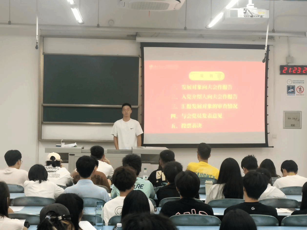 陈逸嘉等43名发展对象依次汇报对党的认识、入党动机、本人履历、家庭和主要社会关系情况以及本人态度。入党介绍人介绍发展对象有关情况,并对其能否入党表明意见。支部书记报告对发展对象审查的情况。与会党员发表意见,对发展对象能否入党进行充分讨论。与会党员采取无记名投票方式进行表决。大会同意接收陈逸嘉等43名同志为中共预备党员。