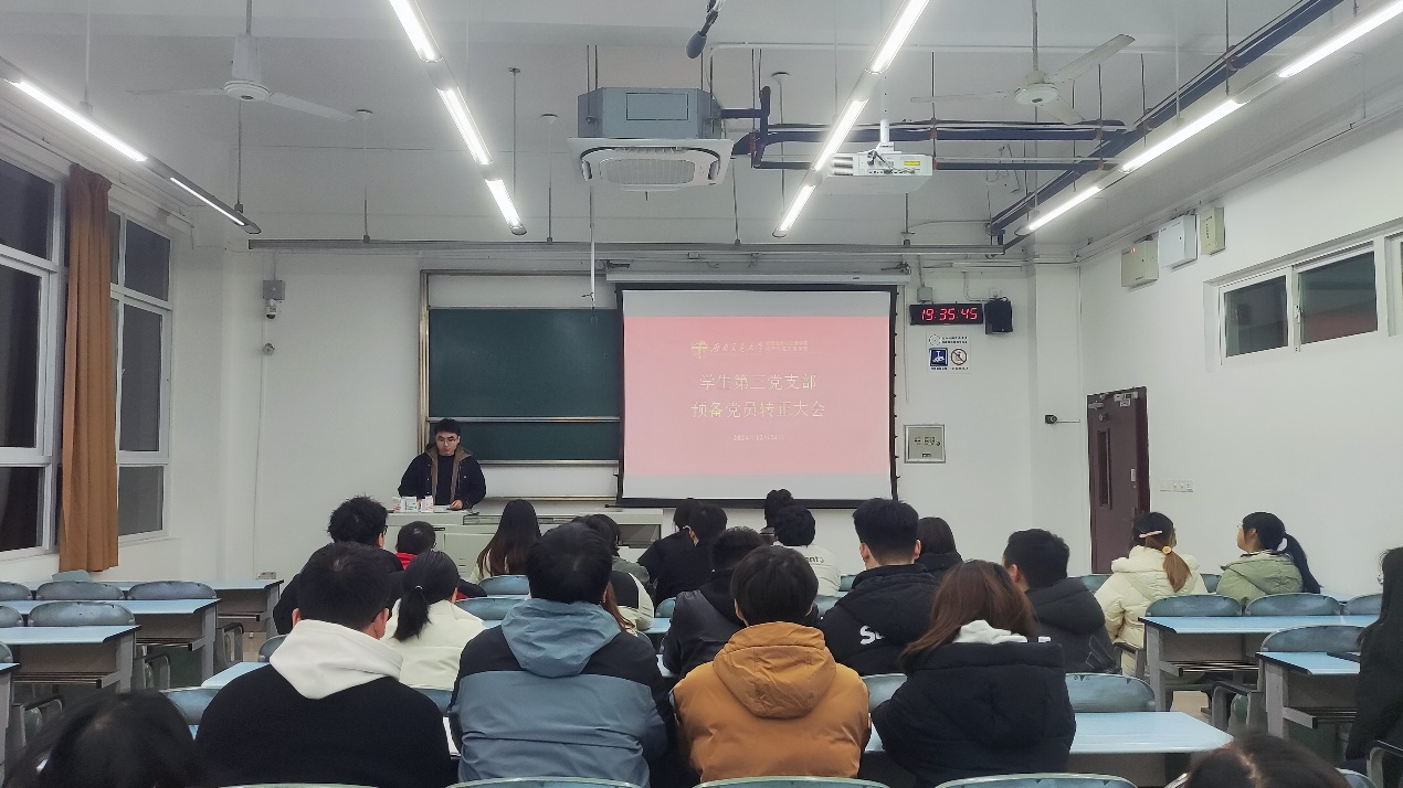 预备党员荆冉旭等34名同志分别围绕思想政治、学习生活、纪律作风等方面依次汇报自己在预备期的表现,总结了成绩和进步,找出了缺点和不足。支部书记报告对预备党员在预备期间的教育和考察情况。与会党员充分发表意见,并采取无记名投票的方式进行表决。大会同意荆冉旭等34名同志按期转正。