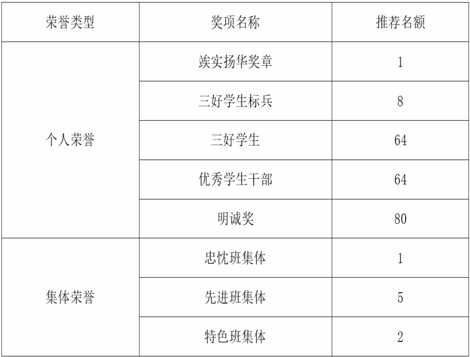 注:校级学生组织的“优秀学生干部”、“明诚奖”由相应学生组织学生奖励评议小组民主评议推荐人选,报党委学生工作部。党委学生工作部将拟推荐人选推荐至各学院,并将相应名额追加至各学院。