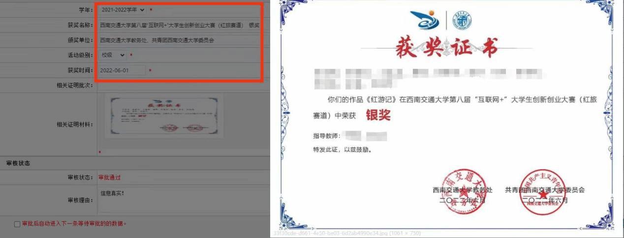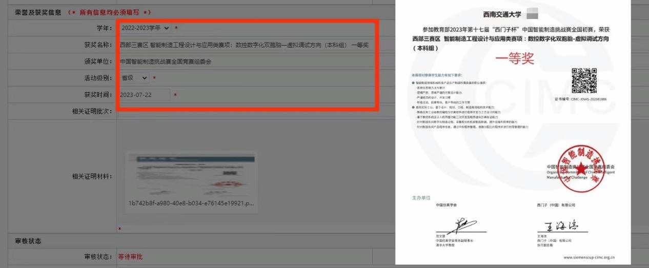学年勾选2023-2024学年,获奖名称、获奖单位按照获奖证书或相关成绩证明填写完整,不得简写或缩写,相关证明材料需上传获奖证书或相关成绩证明(扫描版),示例如下: