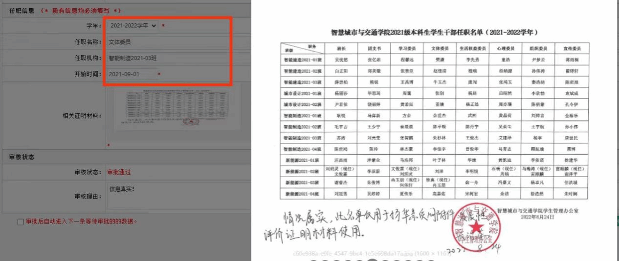 学年勾选2023-2024学年,任职名称、任职机构填写完整,班委任职机构按照“智能建造2022-01班”格式填写,相关证明材料需上传任职证明或加盖公章证明(扫描版),示例如下:
